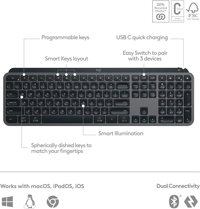 | Ergonomic Design | The MX Keys S is designed with a slight tilt to reduce strain on your wrists, promoting a healthier typing posture |