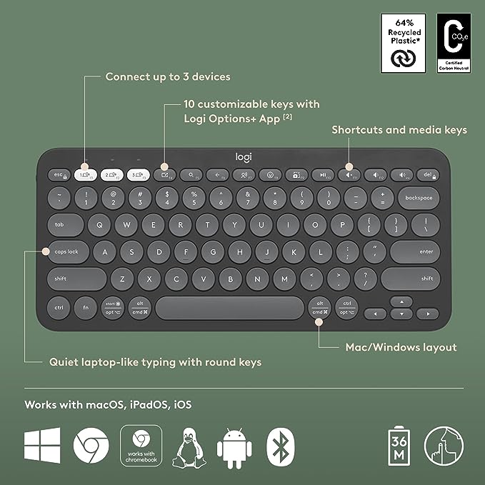| Multi-Device Connectivity | Easily switch between up to three devices with the touch of a button, allowing you to type on your computer, tablet, and smartphone effortlessly |