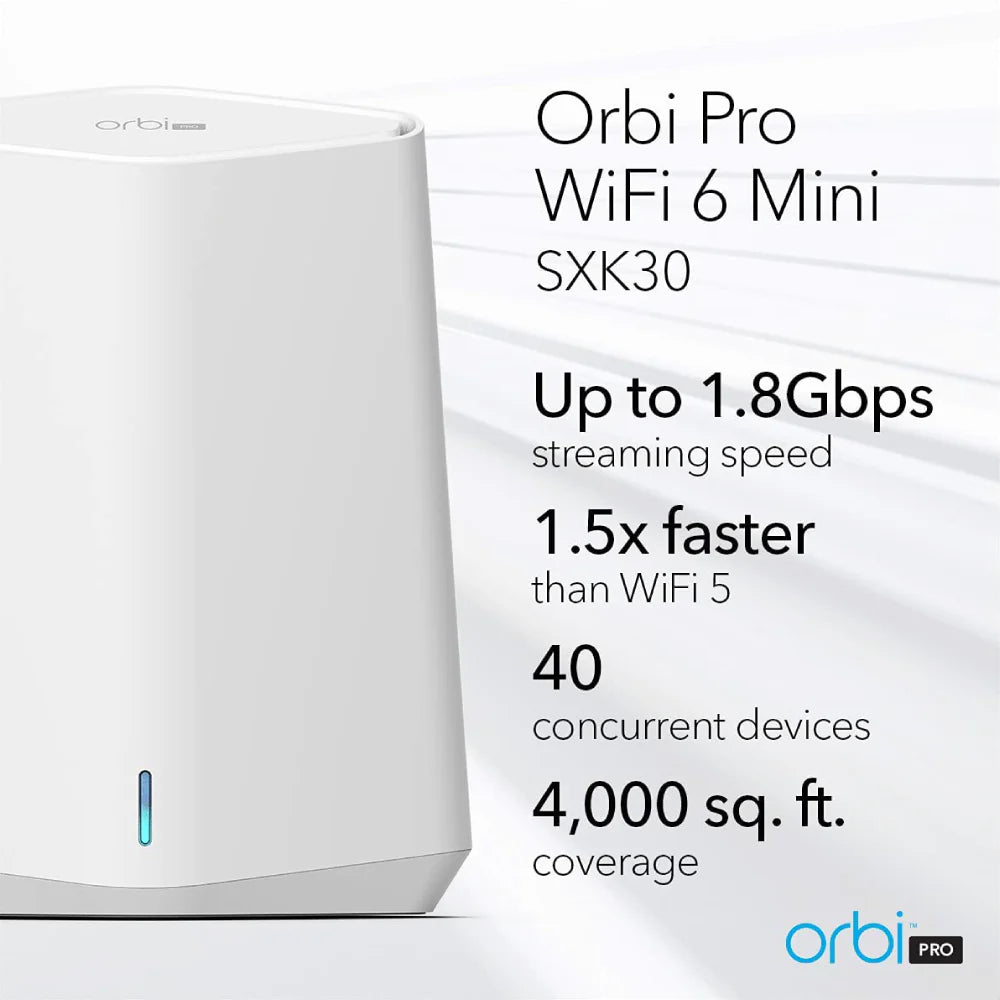 Orbi Pro WiFi 6 Mini (AX1800) Mesh System is built to provide your business or your home office with next-level coverage, speed, and connection capacity for the ultimate business-grade Wi-Fi experience, today and tomorrow at an affordable cost for budget conscious businesses.
